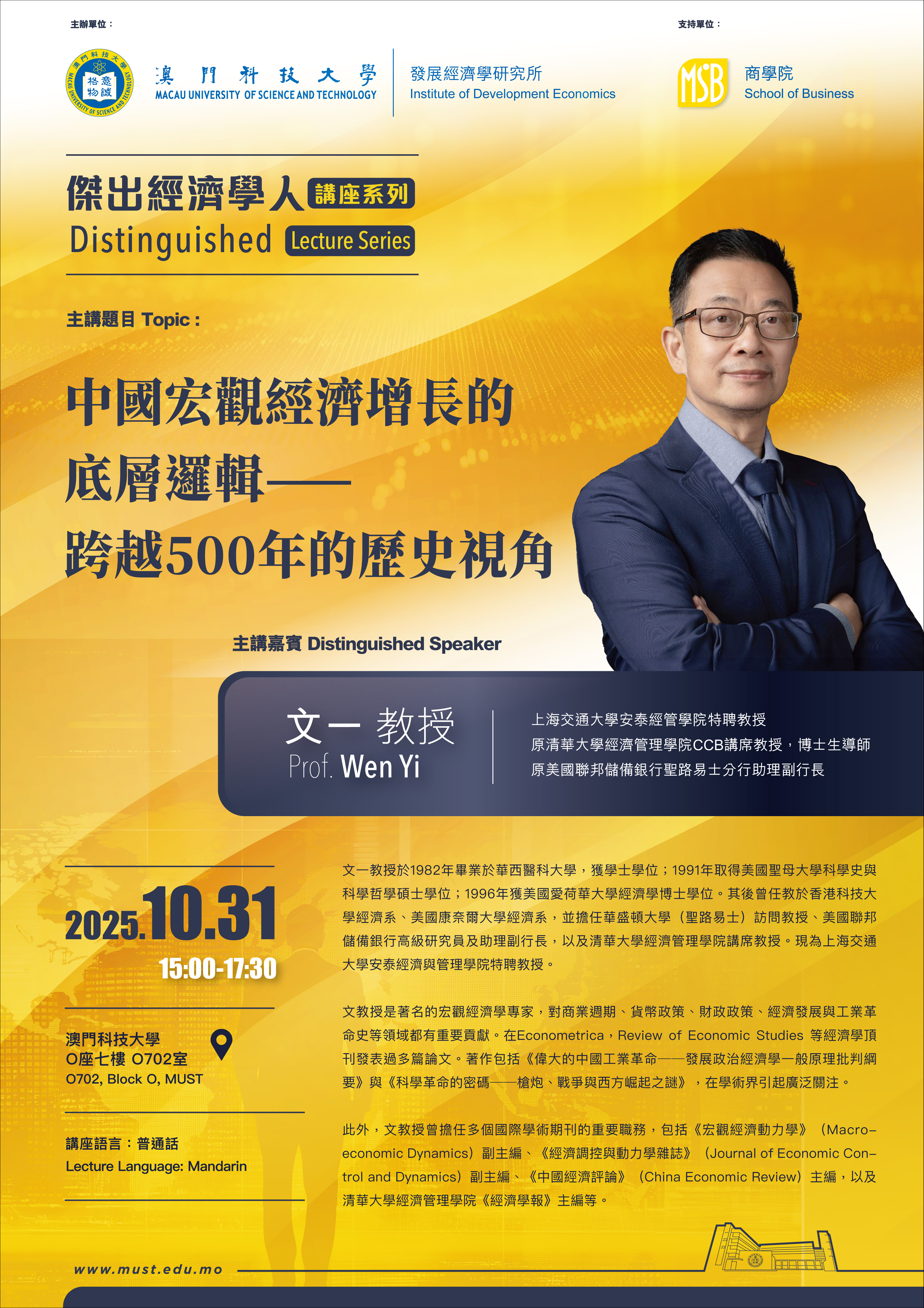 杰出经济学人讲座系列讲座 日期:2025年10月31日(周五)时间:下午3:00-5:30地点:澳科大O702教室讲座语言:普通话主题: 《中国宏观经济增长的底层逻辑——跨越500年的历史视...